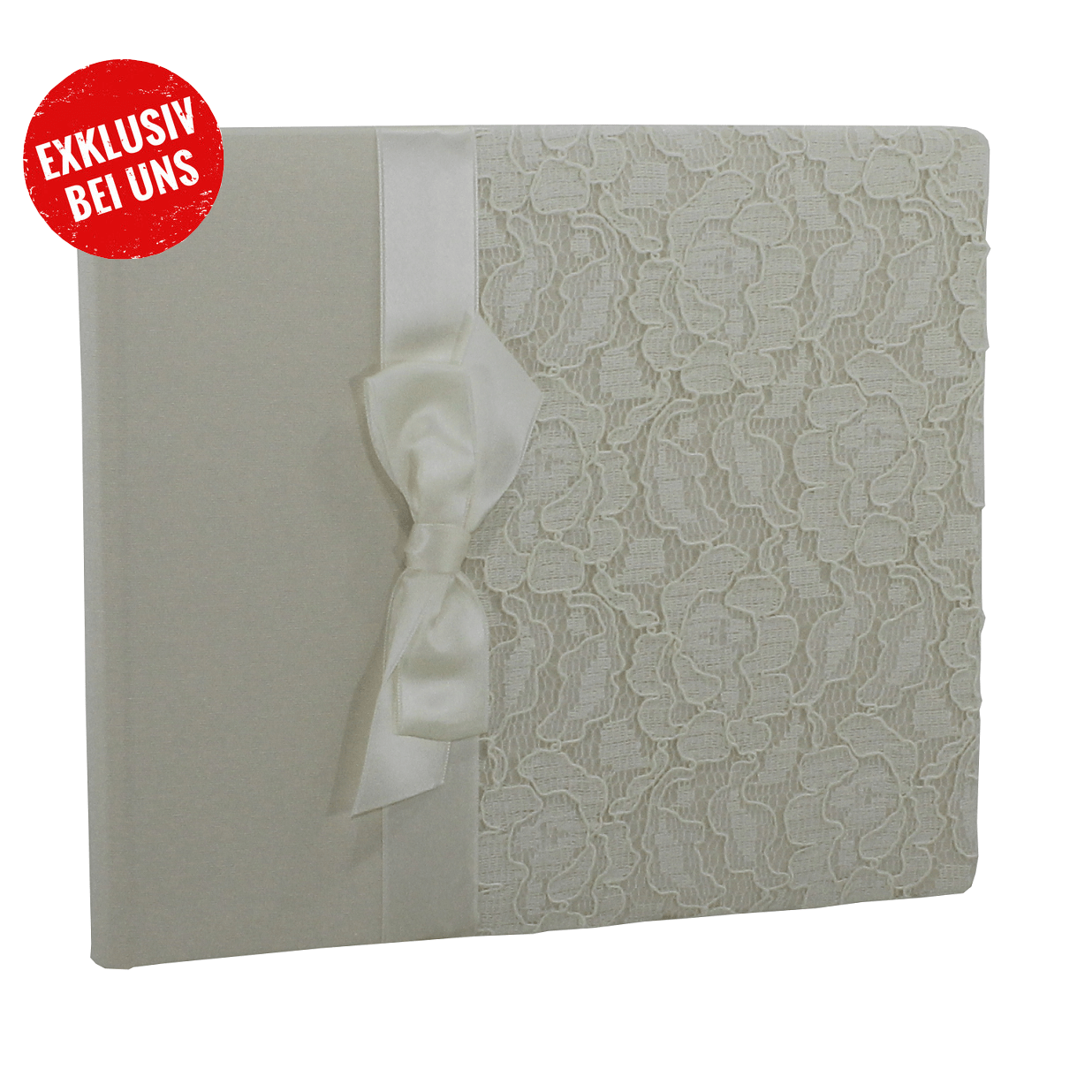 Das Gästebuch zur Hochzeit Vintage Elegant vereint hochwertige spanische Spitze mit einer eleganten Schleife zu einem Einschreibebuch der Extraklasse für Ihre Hochzeitsgäste. Dabei ist der cremefarbene Stoffeinband auf der Vorderseite zu 2/3 mit eleganter cremefarbener Spitze verziert. Dieses wunderschöne handgefertigte Gästebuch in Querformat wird durch die elegante Schleife in Creme abgerundet, die es zu einem wahren Hingucker macht.