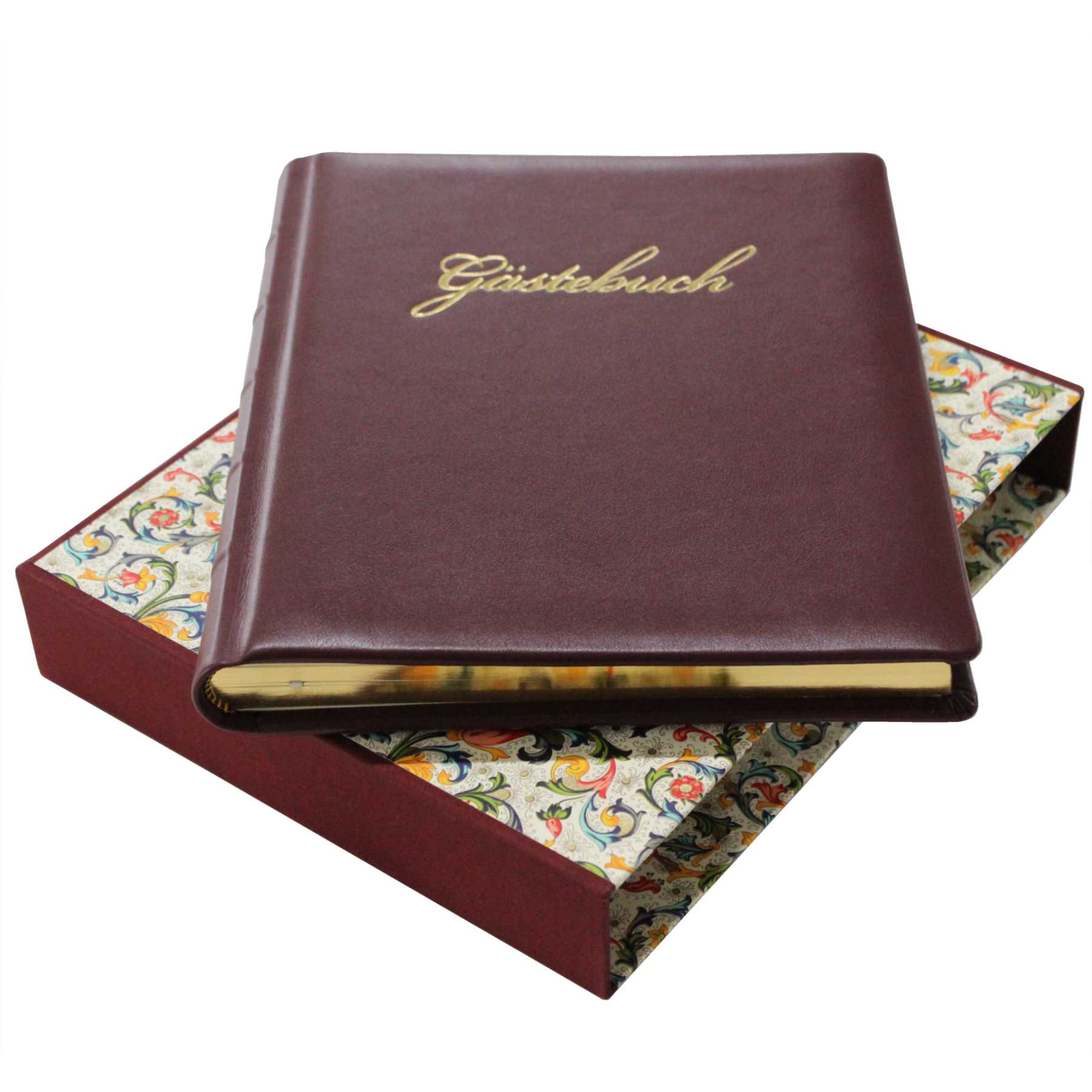 Passend zu diesem Gästebuch können Sie auch entsprechende Einschreibbücher, Fotoalben oder Foto-Gästebücher in Leder erhalten. Gerne fertigen wir auch ein Gästebuch Leder mit Goldschnittblock für Sie an.