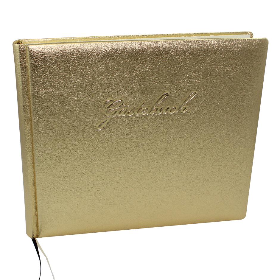 Das Erscheinungsbild des Gästebuches wird durch die elegante Goldprägung in Schreibschrift „Gästebuch“ perfekt abgerundet.