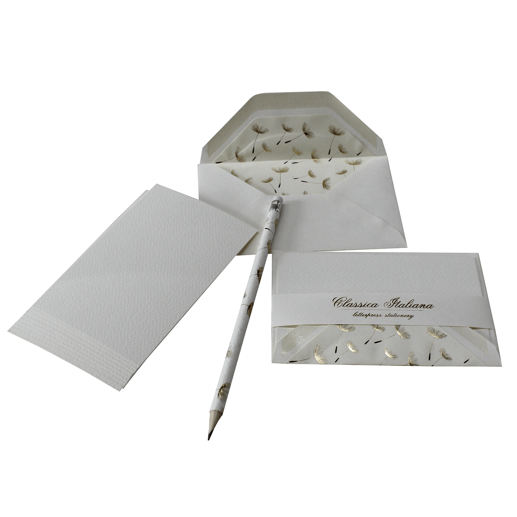 Das elegante Kartenset Dente di Leone in einer praktischen Geschenkbox besteht aus 10 Tischkarten und 10 Umschlägen. Die Karten und Umschläge befinden sich in einer durchsichtigen Schachtel. Die Blanco-Karten Messen 13 cm x 8,5 cm und lassen sich ganz nach Ihren Wünschen gestalten. Die passenden Umschläge in der Größe 13,8 cm x 9 cm sind im Inneren mit goldenen Pusteblumensamen verziert. Das hochwertige Büttenpapier eignet sich hervorragend zum Schreiben mit einem Füllfederhalter.