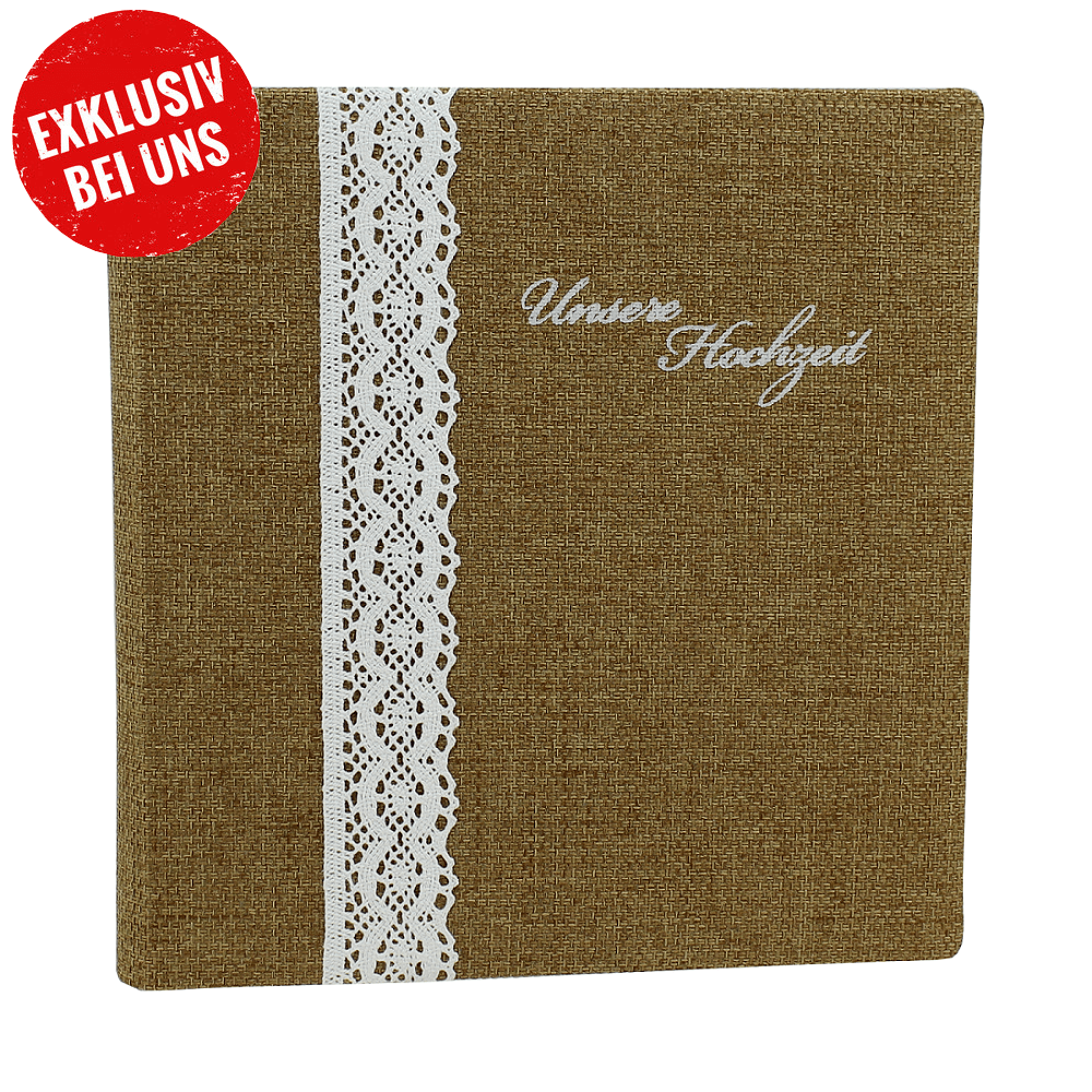 Im eigenen Hochzeitsalbum Vintage Rustico zu blättern, ist wie eine Reise zurück zu dem schönsten Tag im Leben. Nur beste Qualität und echte deutsche Handarbeit lassen dieses Fotoalbum für Sie zum perfekten Rahmen für Ihre Hochzeitsfotos werden! Wunderschöne Kontraste bilden der rustikale braune Leineneinband kombiniert mit beiger Baumwollspitze und der weißen Prägung „Unsere Hochzeit“.