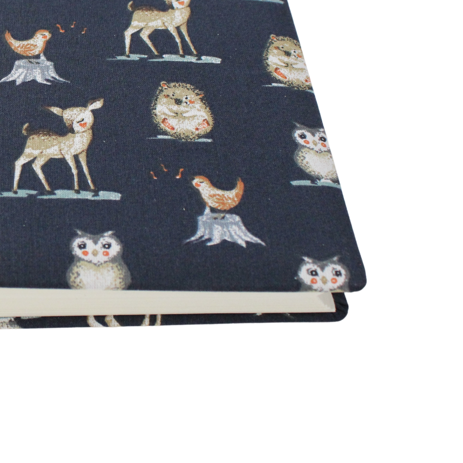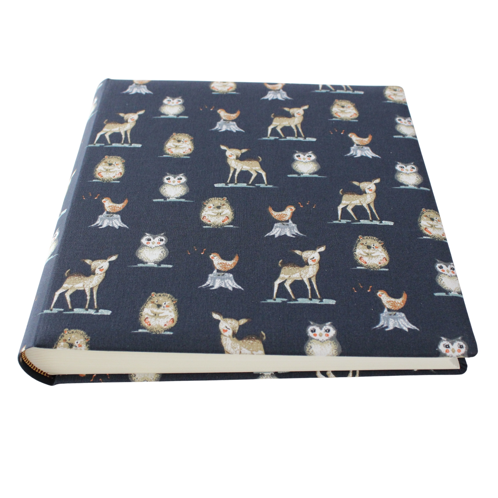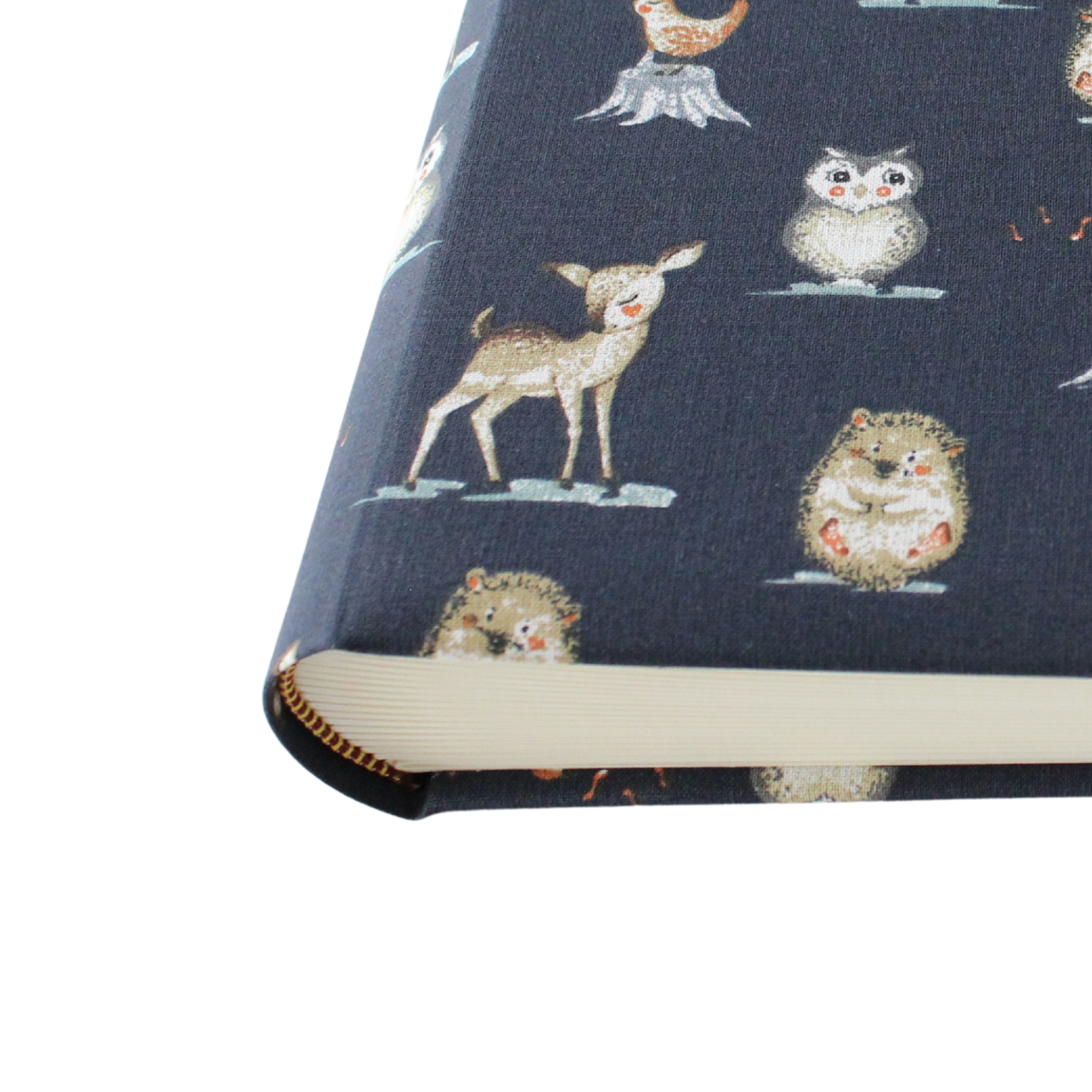 Der Baumwollstoff des Kinder-Fotoalbums Night Forest, überzeugt durch seine sanften Farben und seine kindgerechten Motive. Der in Märchenhaften gehaltenen Baumwoll-Stoffeinband stammt aus deutscher Herstellung und ist zu 100 Prozent chemiefreie verarbeitet.