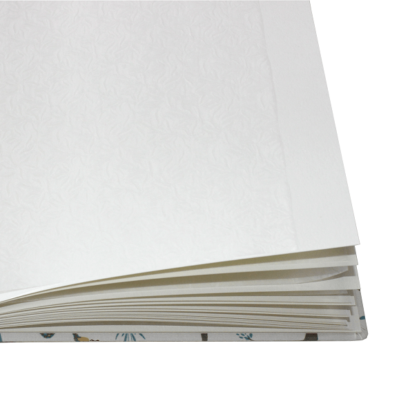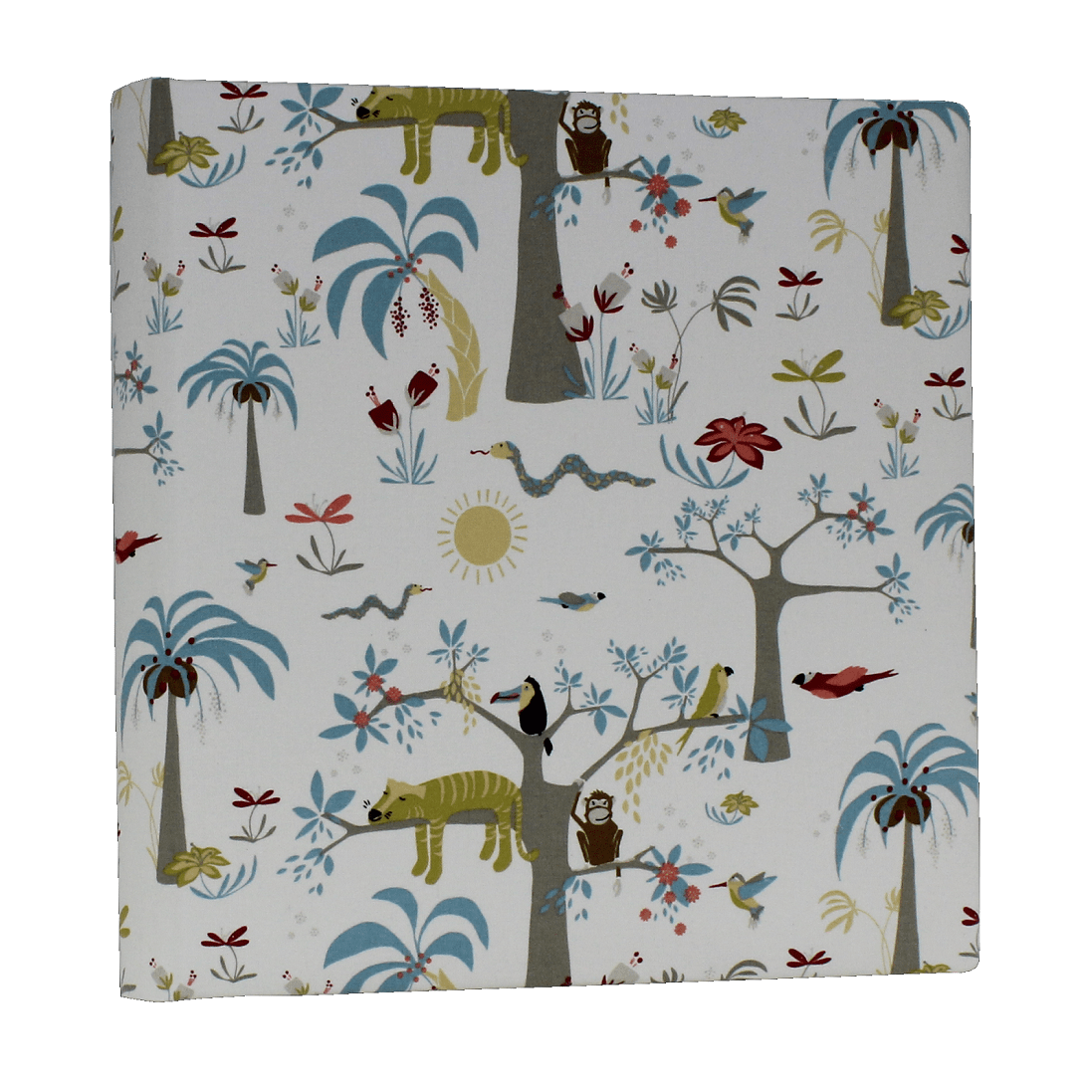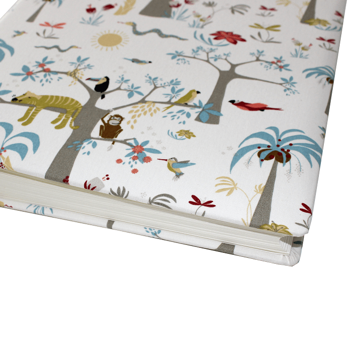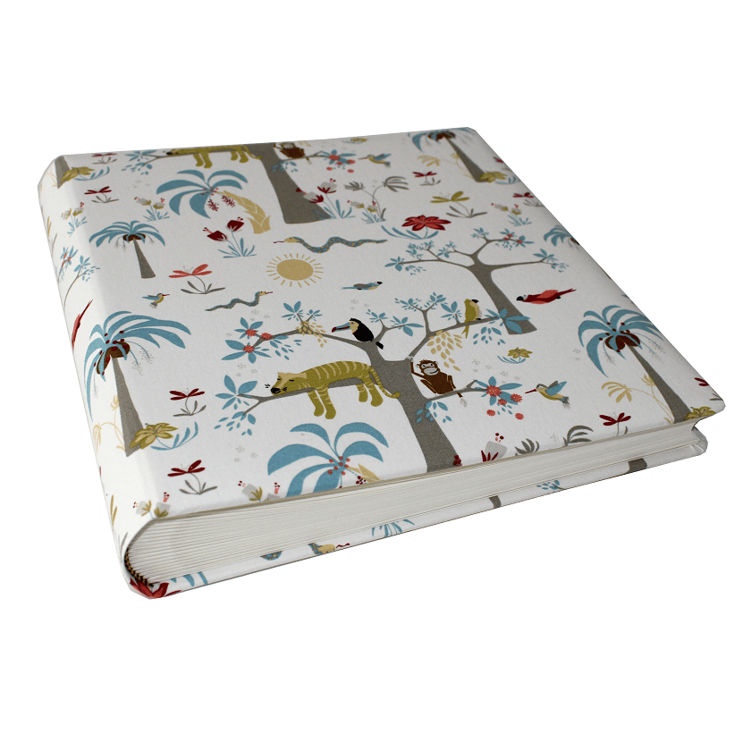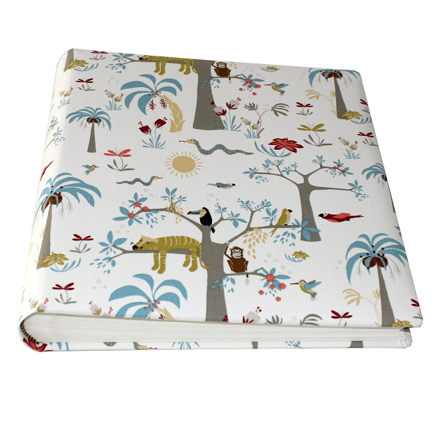 Der verspielte Stoffeinband mit Dschungelmotiven zaubert garantiert ein Lächeln ins Gesicht Ihres Kindes. Auf dem beigen Hintergrund können kleine Augen Bäume, Vögel, Blumen und süße Dschungelbewohner entdecken. Dieses verspielte Softcover-Fotoalbum der Buchbinderei Vera Donna begeistert Groß und Klein.