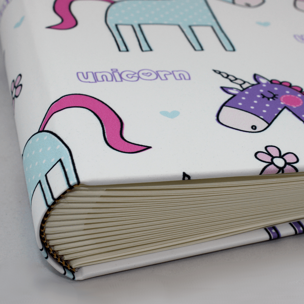 Dieses süße Fotoalbum der Vera Donna Manufaktur, wird in reiner deutscher buchbinderischer Handarbeit hergestellt und besticht durch seine einzigartige Optik. Die aufgedruckten farbenfrohen Einhörner auf dem weißen Untergrund wirken wie handgemalt und sind als Motiv bei Jung und Alt beliebt. Der Stoffeinband dieses Fotoalbums hat eine ganz besondere Haptik aus samtweich gekämmter Baumwolle.