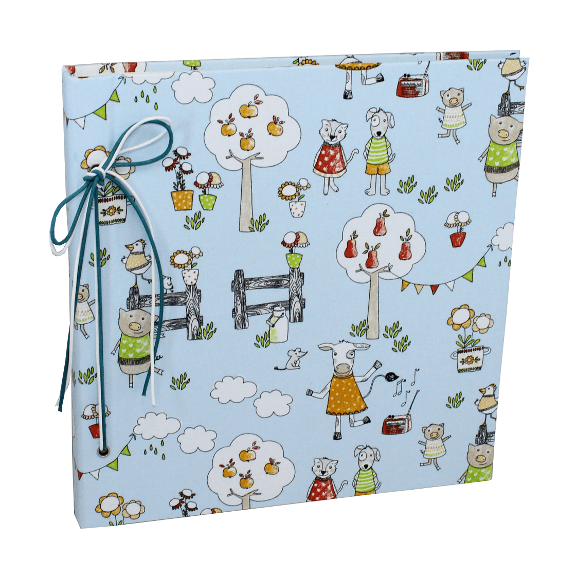 Das süße Kinderalbum „im Garten“ mit Kordelbindung besticht durch seine mit bunt bedrucktem Stoffeinband wird in reiner buchbinderischer Handarbeit gefertigt. Der aus einem kindgerechten Baumwollstoff gewebte Stoff wird in Deutschland hergestellt und ist mit süßen Gartenmotiven bedruckt. Die in zarten Farben gestalteten Motive zaubern dem Betrachter ein Lächeln ins Gesicht. Zu sehen sind mit bunten Kleidchen und Accessoires ausgestattete Schweinchen, Katzen, Kühe und Vögel in einem Bauerngarten mit Obstbäumen, Blumen und vorwitzigen Mäusen. Auf dem blauen Untergrund sind die Details des Gartenmotivs in zarten Rot, Orange, Beige und Grüntönen gehalten. Zusätzlich schmücken Wolken und kleine Gartenszenen den Hintergrund. Das hochwertig verarbeitete Fotokordelalbum mit passender Lederschlaufe ist durch seine chemiefreie Verarbeitung für den Einsatz im Kinderzimmer bestens geeignet.