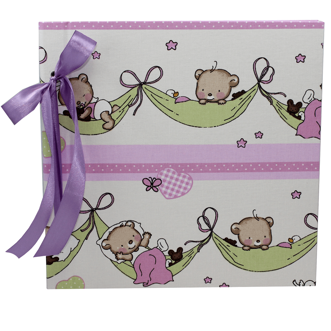 Dieses kindergerechte Album der Vera Donna Manufaktur, wird in reiner deutscher buchbinderischer Handarbeit hergestellt und besticht durch seine einzigartige Optik. Der Einband besteht aus einem für Kinder geeigneten, chemiefreien Baumwollstoff der mit süßen Teddy Motiven bedruckt ist. In den Farben rosé und zartgrün gehalten, sind die niedlichen Teddybären mit ihren Schlummer-Hängematten bei Kindern sehr beliebt. Mit farblich passender Satinschleife gebunden.