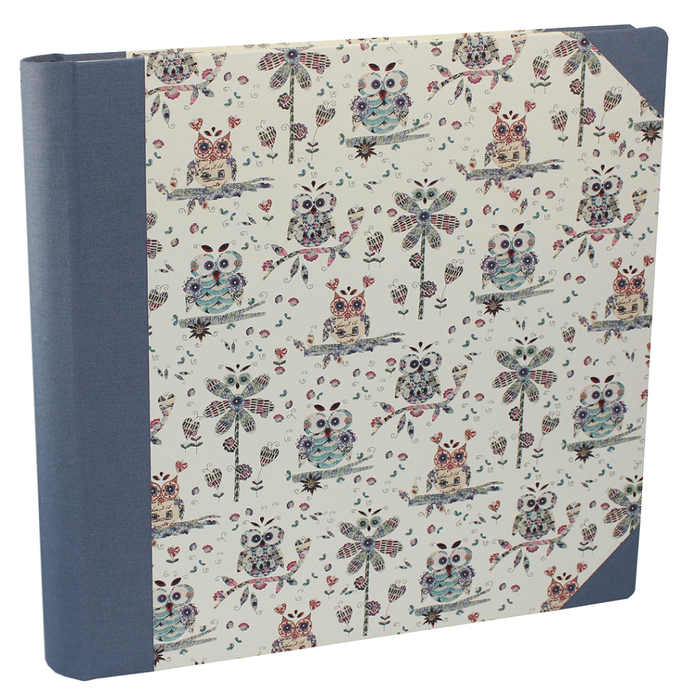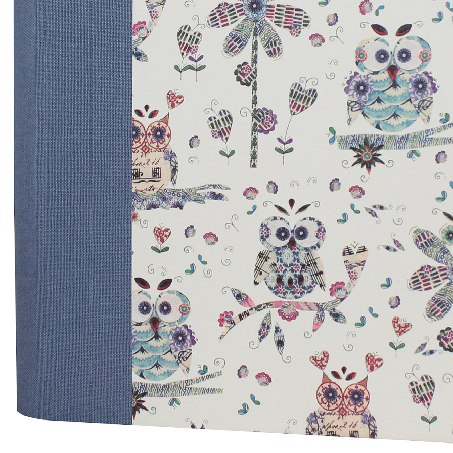 Der Papiereinband ist bedruckt mit einem charmanten Eulenmuster, der blaue Buchbinderleinen verleiht diesem Fotoalbum zudem eine zeitlose Eleganz. Der Einband besteht aus stabiler Kartonage, die Ihre Fotos sicher schützt und das Album langlebig macht.
