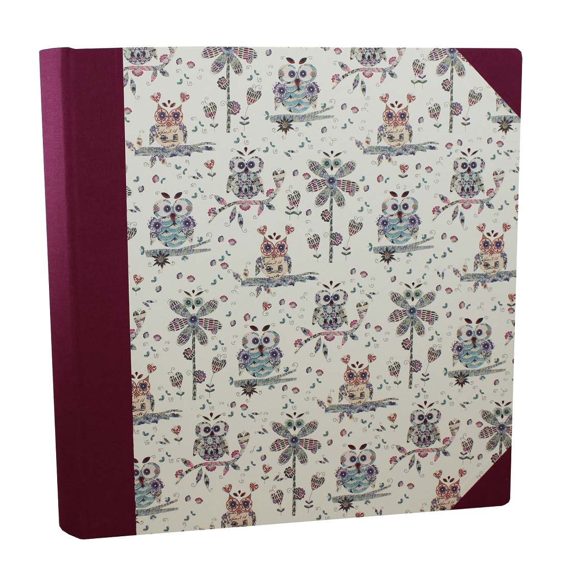 Der Papiereinband ist bedruckt mit einem charmanten Eulenmuster, der weinrote Buchbinderleinen verleiht diesem Fotoalbum zudem eine zeitlose Eleganz. Der Einband besteht aus stabiler Kartonage, die Ihre Fotos sicher schützt und das Album langlebig macht.