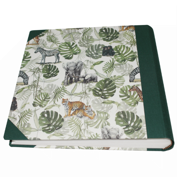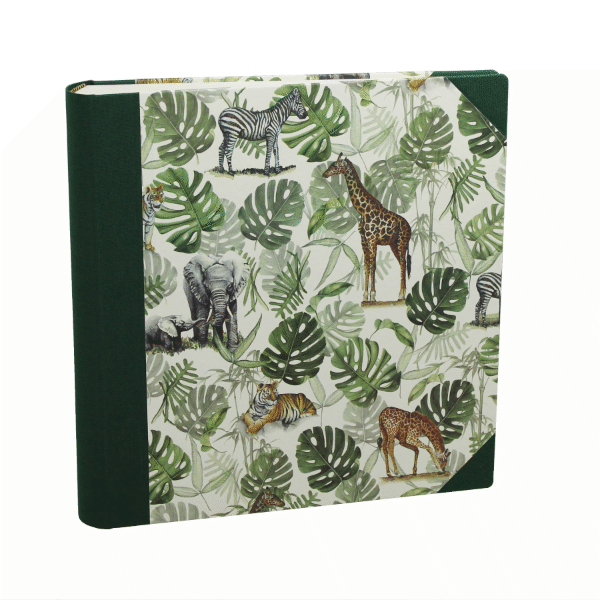 Der Papiereinband ist bedruckt mit afrikanischen Tiermotiven. Der Druck der Tiere ist immer anders, daher ist jedes Fotoalbum ein Unikat! Die grüne Buchbinderleinen verleiht diesem Fotoalbum zudem eine zeitlose Eleganz. Der Einband besteht aus stabiler Kartonage, die Ihre Fotos sicher schützt und das Album langlebig macht.