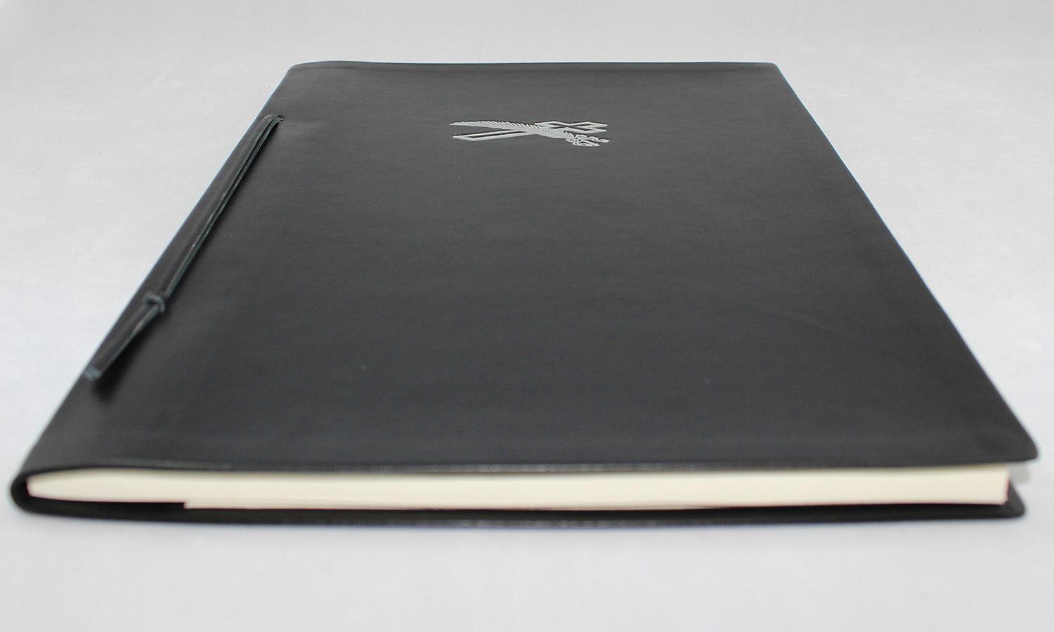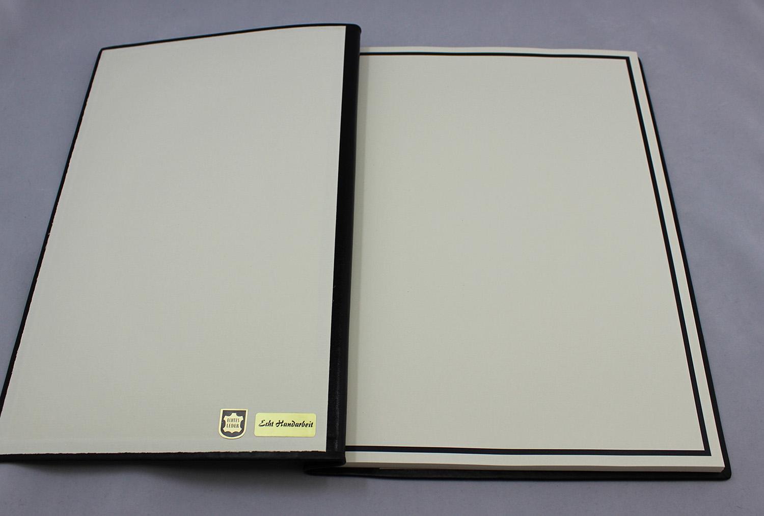 Der Ledercover des Trauerbuches ist mit einem speziellen Flexo-Material verbunden und dadurch flexibel und leicht in der Handhabung. Ein weiteres besonderes Merkmal reiner Handarbeit sind die von Hand eingezogenen „runden Ecken“.