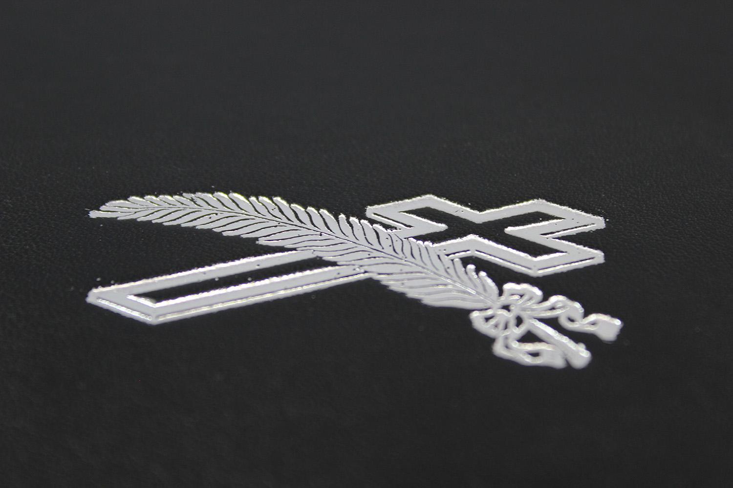 Abgerundet wird das Kondolenzbuch aus Vollrindleder durch eine auf der Vorderseite angebrachte Prägung in silber. Hierzu verwenden wir einen alten historischen Druckstempel mit Trauersymbol „Kreuz und Feder“.