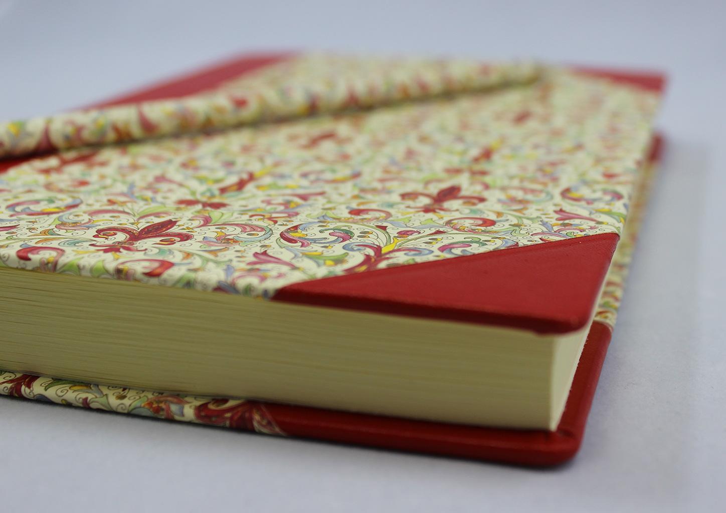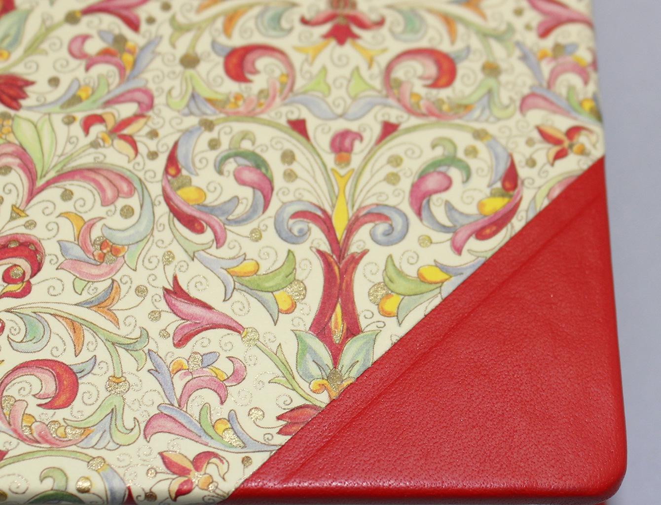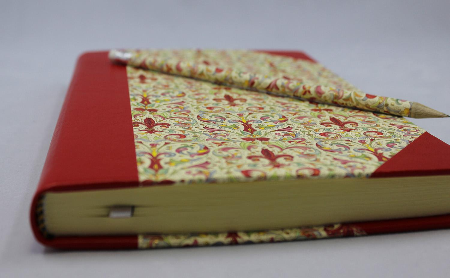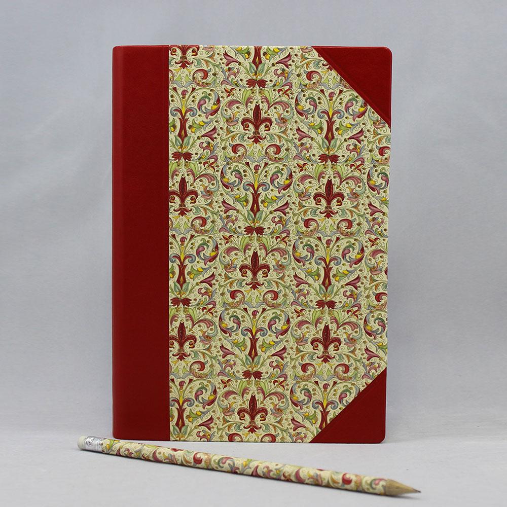 Das Notizbuch Giglio mit passendem Stift und Elementen aus rotem Leder wird aus einer Kombination von fassgegerbtem italienischen Vollrindleder in rot und edlem Designpapier gefertigt. Es wird von uns in rein deutscher buchbinderischer Handarbeit hergestellt. Der Hartcover Papierbezug ist mit dem Fleur-de-lis Blumenmotiv bedruckt. Der Buchrücken und die Buchecken sind mit Leder eingefasst. Als Besonderheit ist ein Bleistift im gleichem Muster im Lieferumfang enthalten.