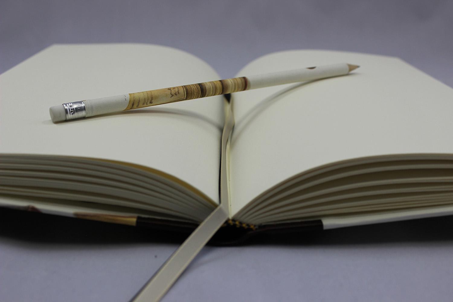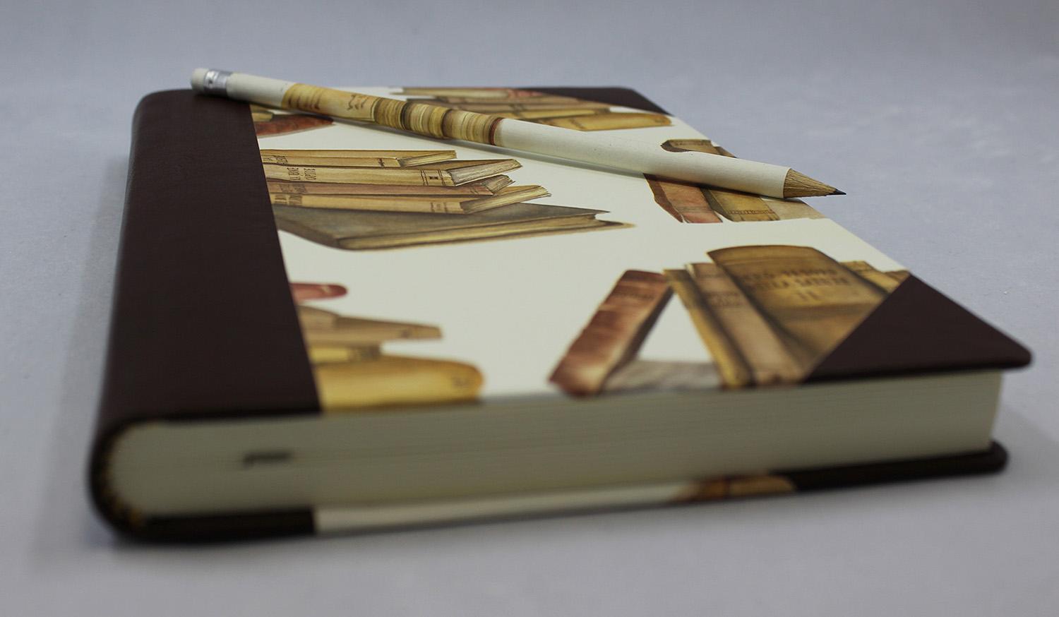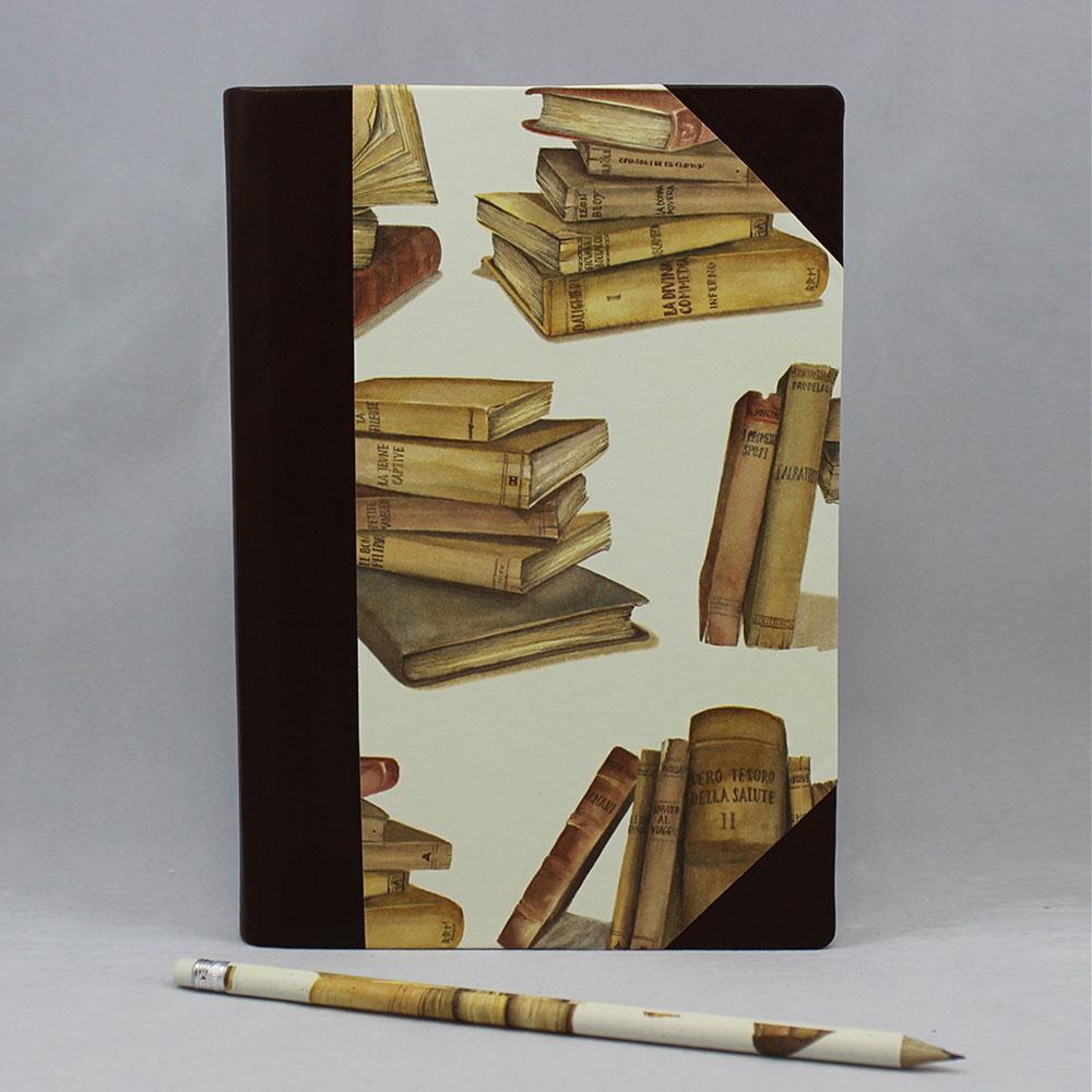 Bestes Fassgegerbtes Vollrindleder in der Farbe Braun und ein farblich passender Papierbezug geben diesem Notizbuch sein besonderes Erscheinungsbild. Im Vintage Stil gemalte Bücher zieren das Cover dieses besonderen Notizbuches. Der Buchrücken und die Ecken sind mit Vollrindleder bezogen, wodurch auch der Ausdruck „Halbleder“ entsteht! Sie werden die Qualität spüren und den unverfälschlichen Ledergeruch lieben. Als highlight ist dem Notizbuch ein Bleistift im passenden Muster beigefügt.