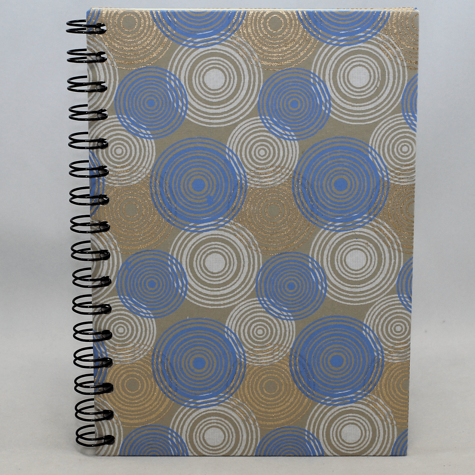 Das Notizbuch INDIANRINGS entsteht aus einem Papiereinband aus Indien. Der Einband mit seinen verschiedenfarbigen Kreis Motiven in blau-gold-weiß wird in einem Offsetdruck hergestellt und besticht durch seinen hohen Baumwollanteil im Papier.
