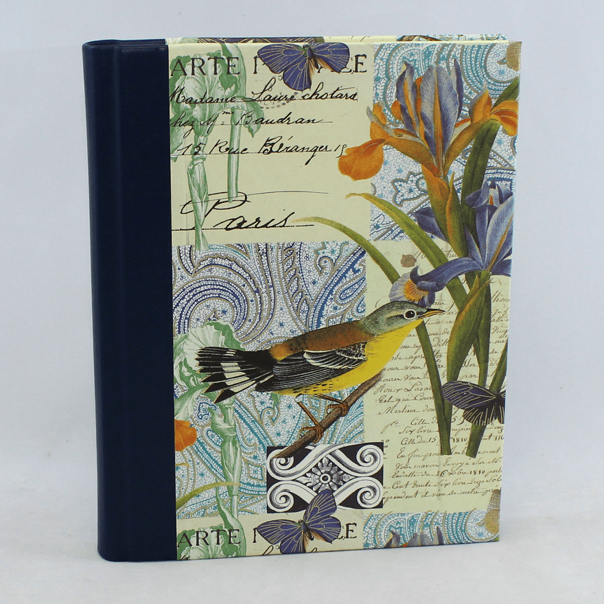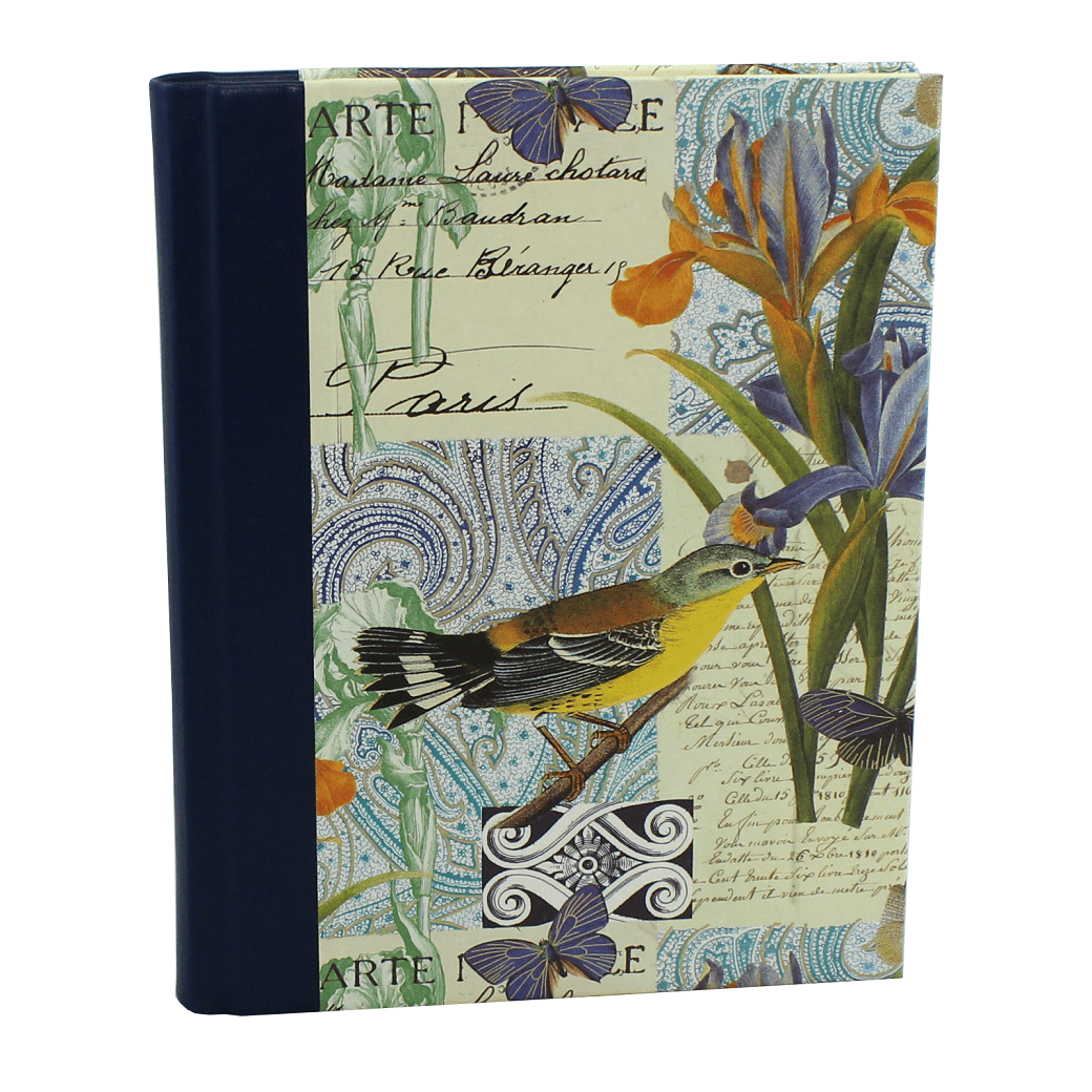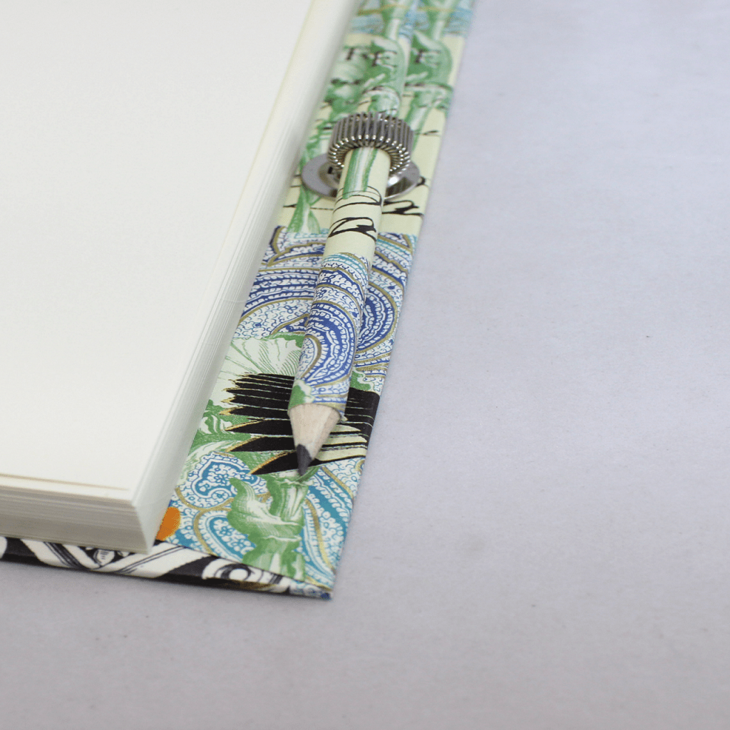 Das Notizbuch Lorenzo mit integriertem Stifthalter entsteht durch eine Kombination aus blauem Vollrindleder und einem wunderschön bedruckten Designpapier mit Blumen, Schriften, verschiedenen Motiven, Vögeln und Schmetterlingen. Der Hartcover Einband, ist aus hochwertigen italienischen Papier bezogen und überzeugt durch die Druckmotive. Als Besonderheit ist im integrierten Stifthalter ein Bleistift im gleichem Design enthalten.