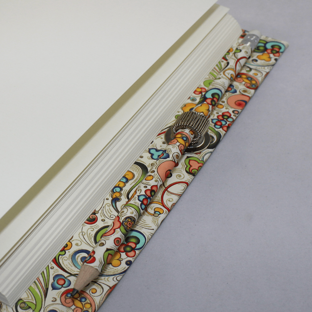 Das Notizbuch Tempesta mit integriertem Stifthalter entsteht durch eine Kombination aus grünem Vollrindleder und einem wunderschön bedruckten Designpapier mit einem farbenfroh stilisierten Blumenmuster. Der Hartcover Einband ist von Hand mit dem hochwertigen italienischen Papier bezogen und überzeugt durch die bunten floralen Druckmotive und edle Goldpulverdetails. Der Buchrücken ist mit bestem fassgegerbtem Leder aus Italien bezogen. Als Besonderheit ist im integrierten Stifthalter ein Bleistift im gleichem Design enthalten.