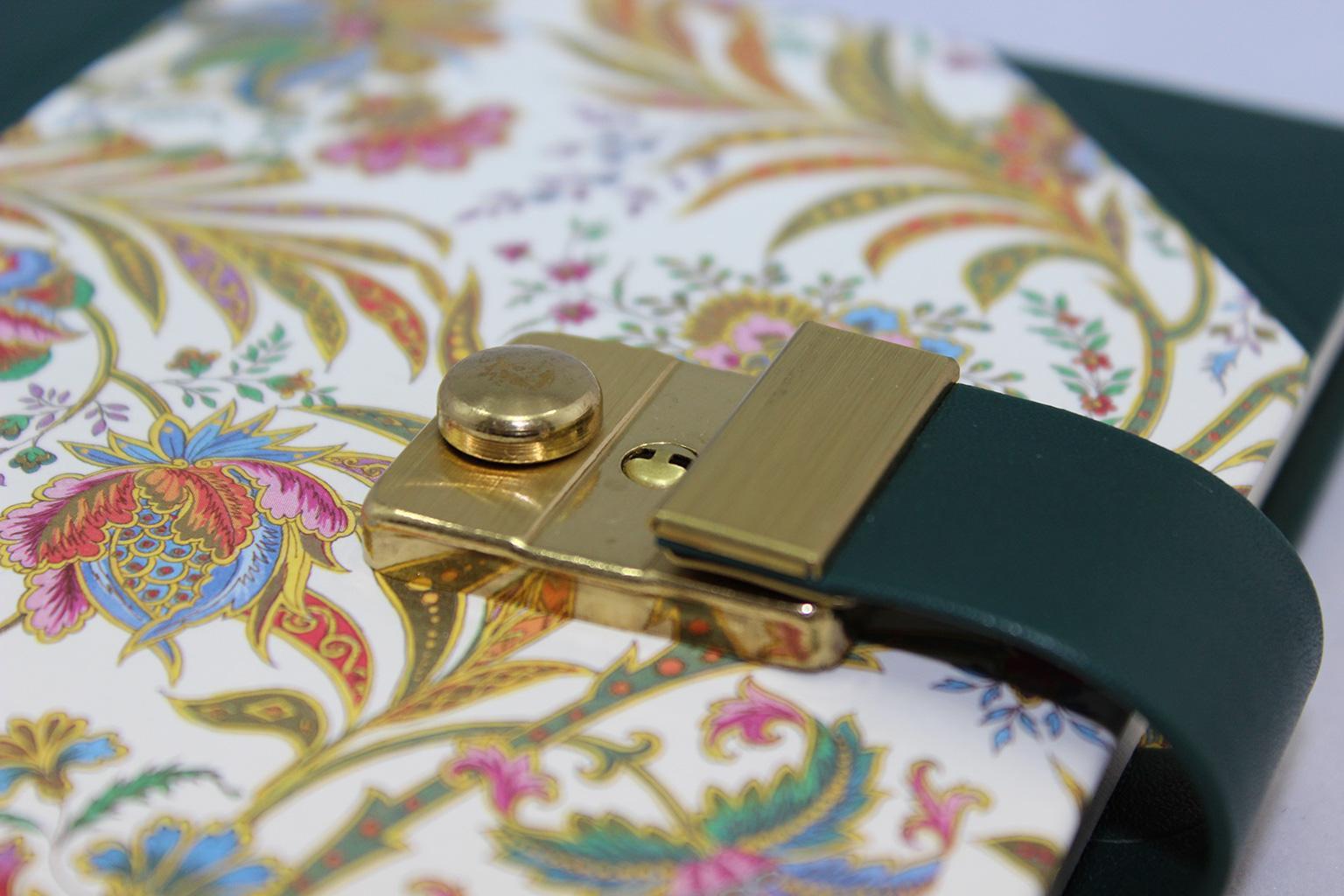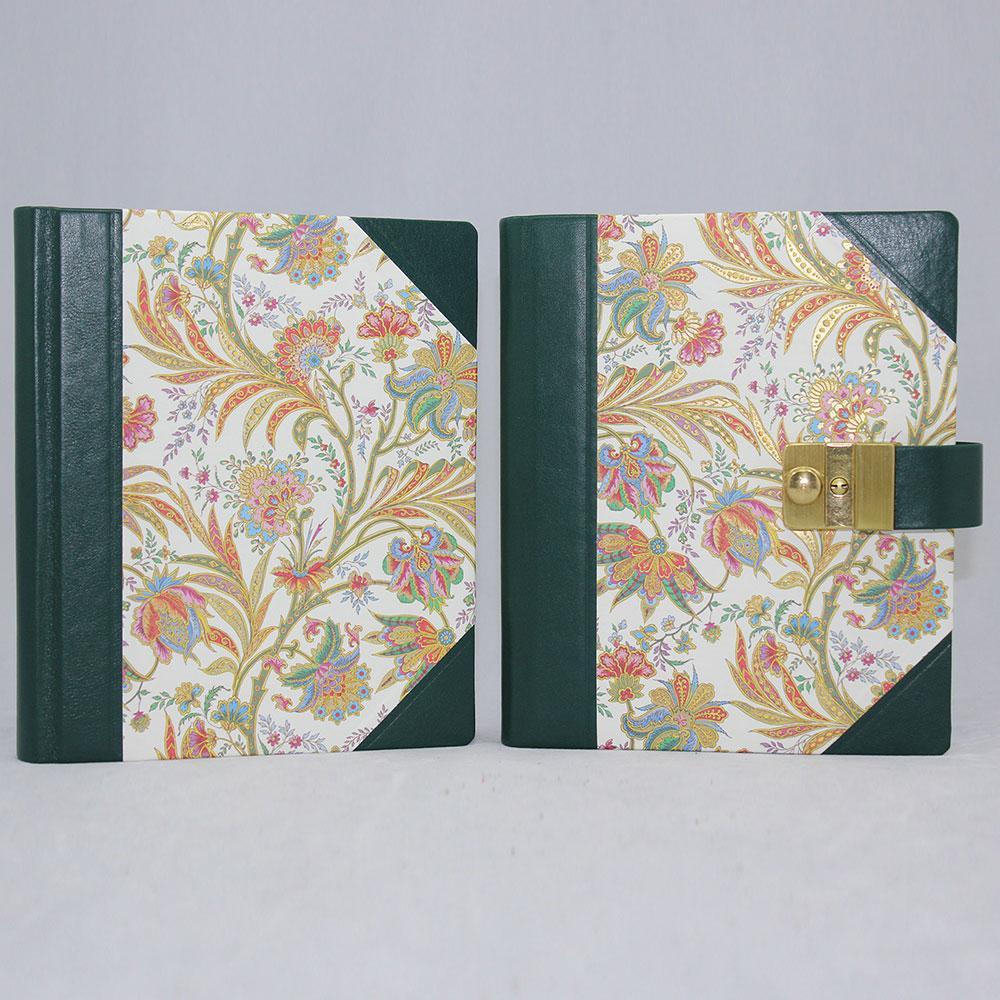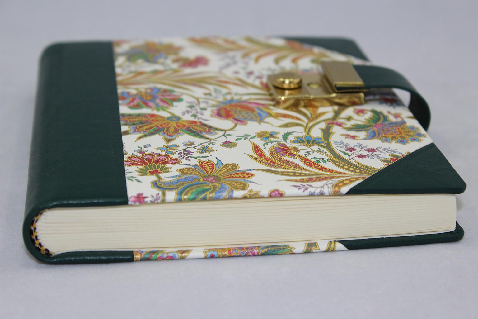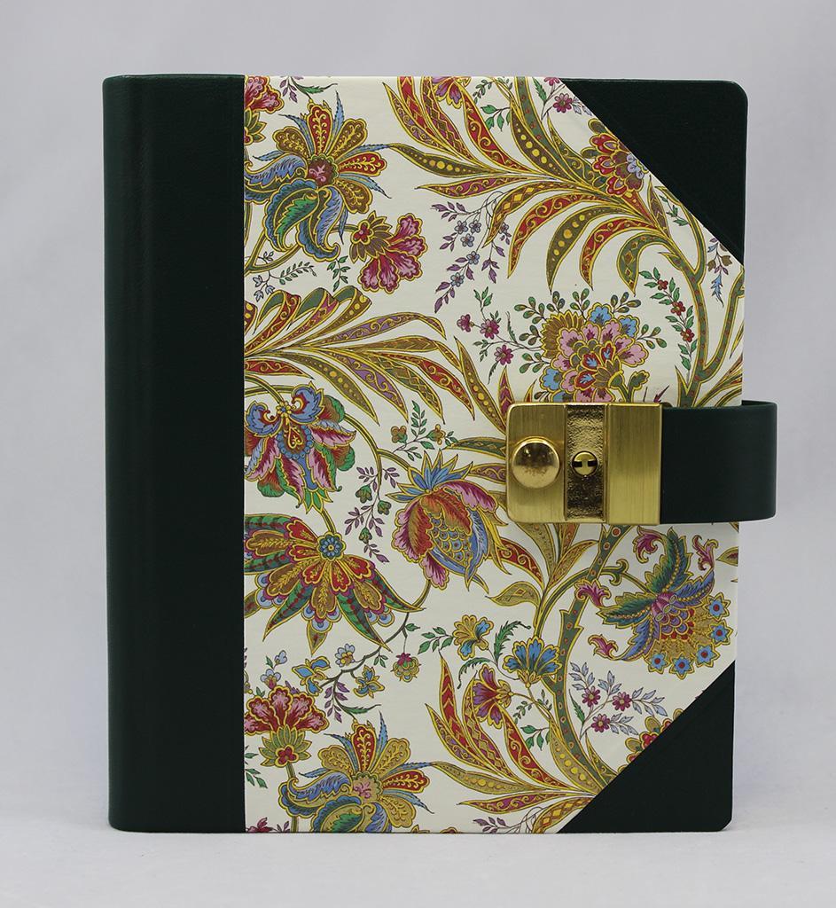 Das Poesiealbum und Tagebuch mit Schloss Ciprio mit grünem Leder wird aus einer Kombination von fassgegerbtem italienischen Vollrindleder in grün und edlem Designpapier gefertigt. Es wird von uns in rein deutscher buchbinderischer Handarbeit hergestellt. Der Hartcover Papierbezug ist mit einem Barocken Blumenmotiv bedruckt und reich mit Goldpulver verziert. Der Buchrücken und die Buchecken sind mit Leder eingefasst.