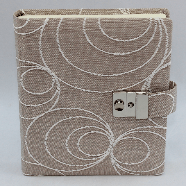 Das Poesie-Tagebuch Lisa mit Schloss, besticht durch seinen pastellfarbenen Baumwollstoff in Lattemacchiato und den kreisförmigen weißen Stickereien.