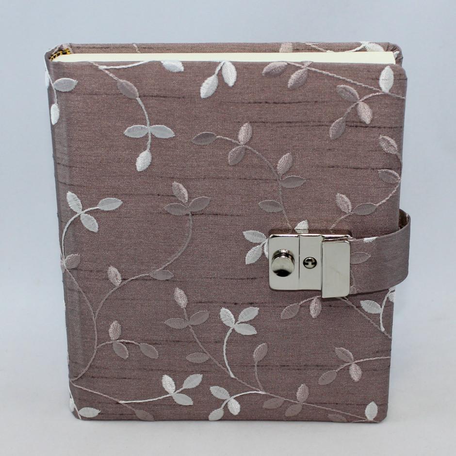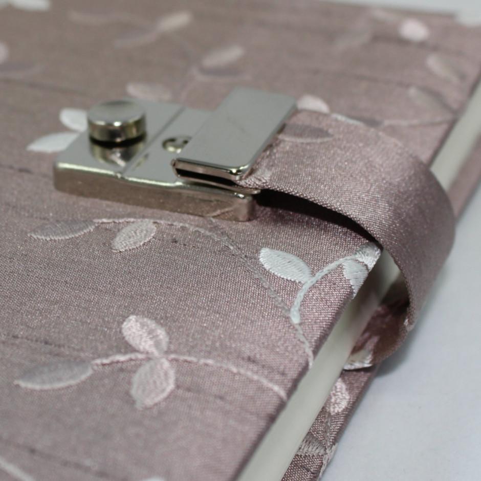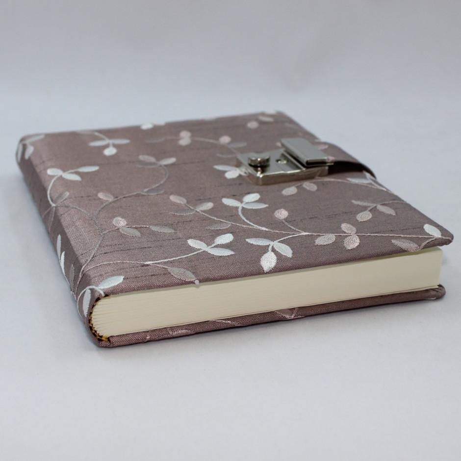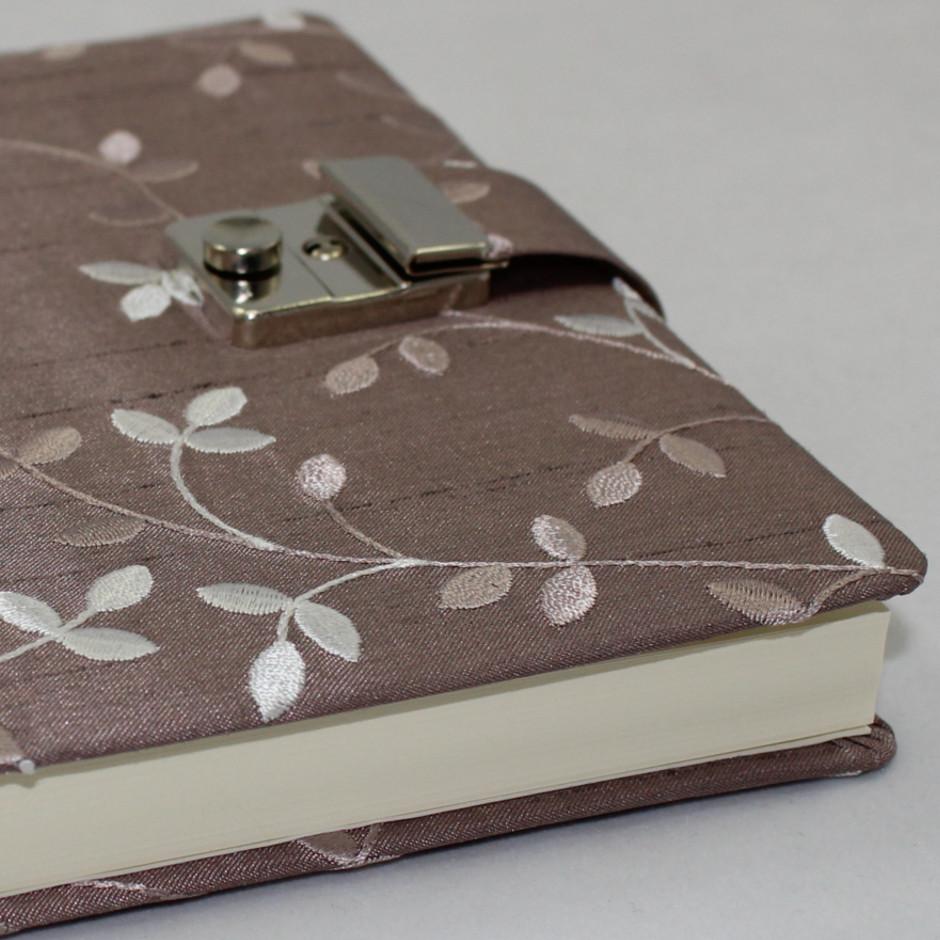 Das Tagebuch „Maysie“ besticht durch seine gestickten rankenförmigen Blätter in verschiedenen flieder- und weißtönen auf feinstem Seidenstoff.