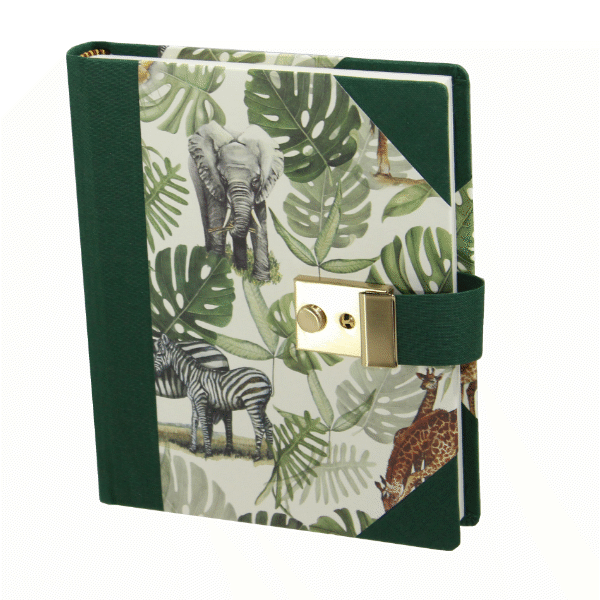 Der Papiereinband ist bedruckt mit afrikanischen Tiermotiven. Der Druck ist immer anders, daher ist jedes Buch ein Unikat! Die grüne Buchbinderleinen verleiht dem Tagebuch zudem eine zeitlose Eleganz. Der Einband besteht aus stabiler Kartonage, die Ihre Eintragungen sicher schützt und das Buch langlebig macht.