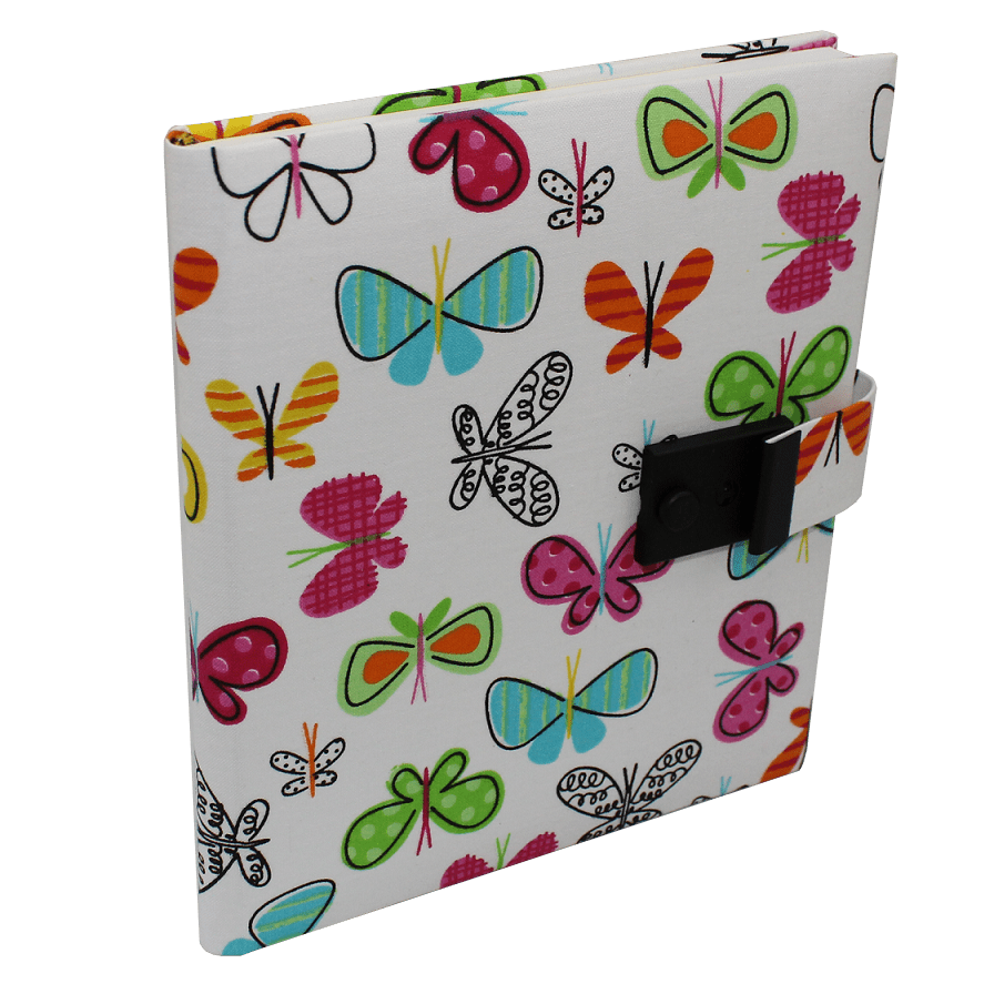 Das Tagebuch mit Schloss Farfalle in Weiß überzeugt durch seinen fröhlichen Stoffeinband mit bunten Schmetterlingsmotiven.