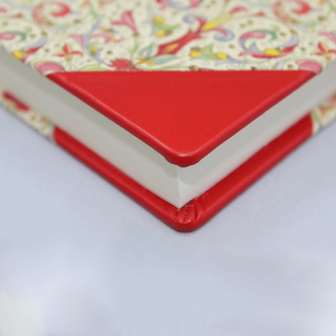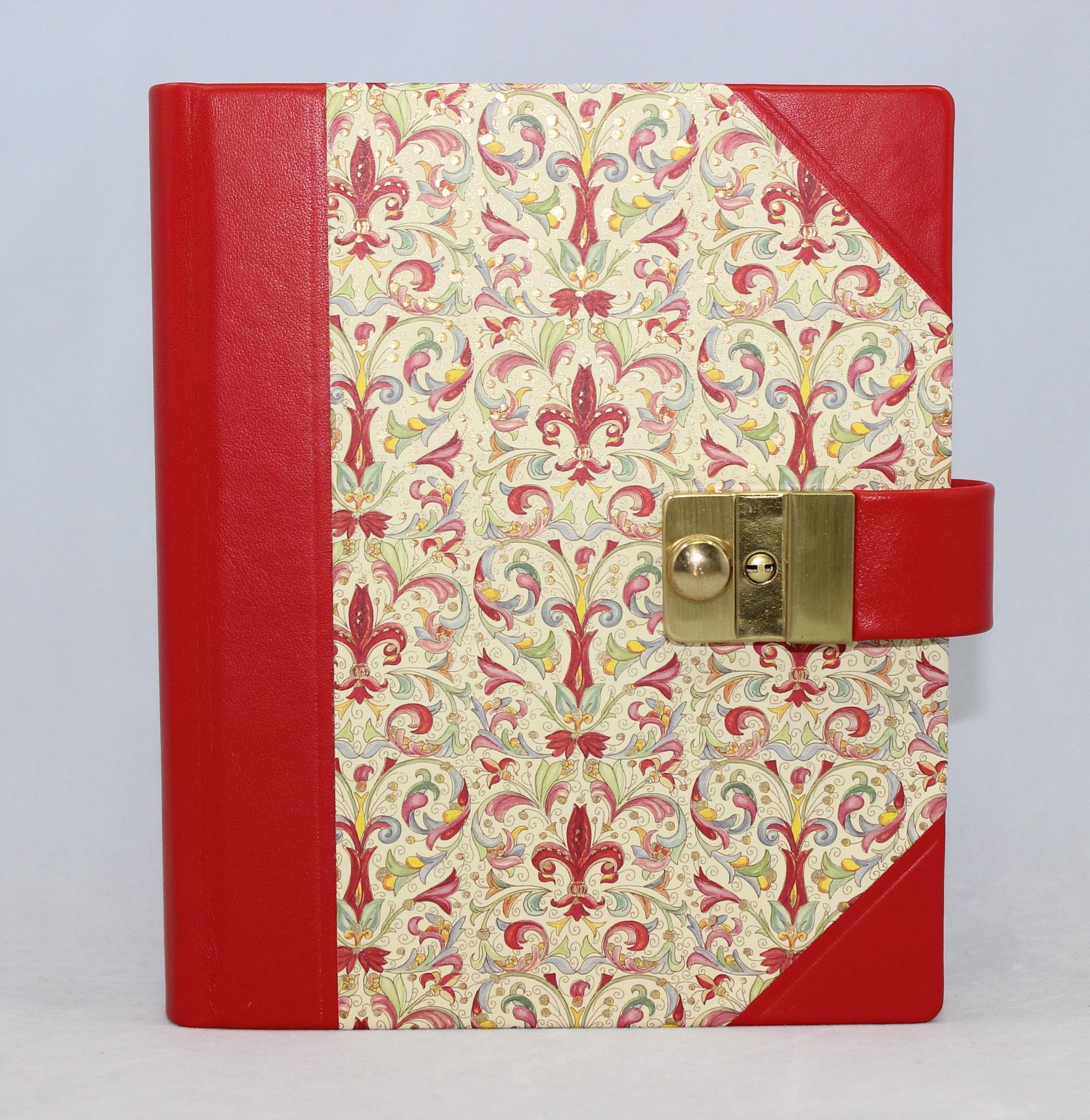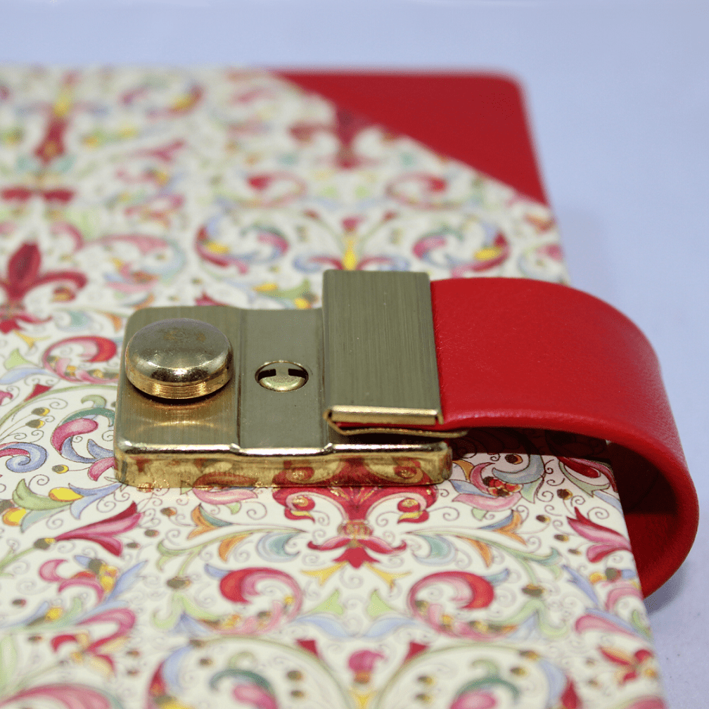 Das Tagebuch Giglio mit Schloss aus Halbleder entsteht durch eine Kombination aus rotem italienischem Vollrindleder, sowie einem farblich dazu passenden hochwertigen Hartcover mit floralem Druck und Goldpulver.