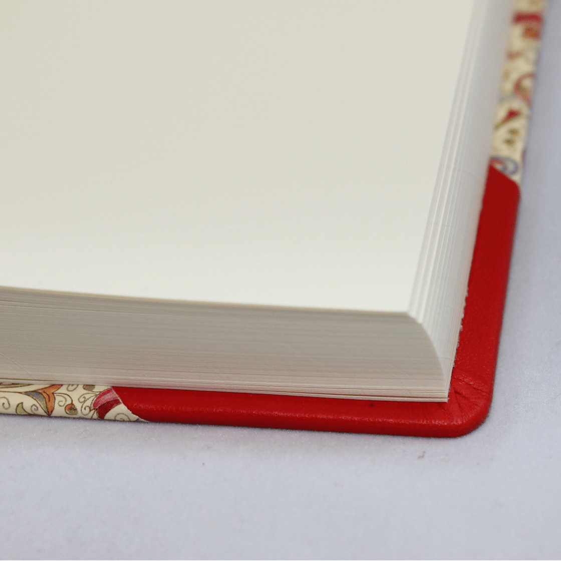 Bestes Faßgegerbtes Vollrindleder in rot und der besonders schöne Papierdruck mit farbenfrohen Blumenmotiven sind etwas ganz besonderes. Der Buchrücken und die Ecken sind mit dem Vollrindleder bezogen. Daher stammt auch der Ausdruck „Halbleder“! Natürlich ist auch der Verschluss in diesem Vollrindleder gefertigt. Sie werden die Qualität spüren und den unverfälschlichen Ledergeruch lieben.
