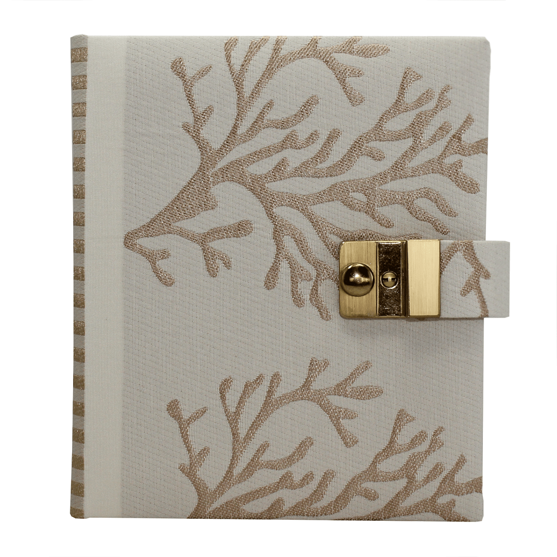 Das Erscheinungsbild des Tagebuchs mit Schloss Koralle wird besonders durch seine lebendigen Muster und die Stickereien in creme-gold geprägt. Besonders hervorstechend ist dabei das Korallenmuster, das dem Tagebuch seinen Namen verleiht.
