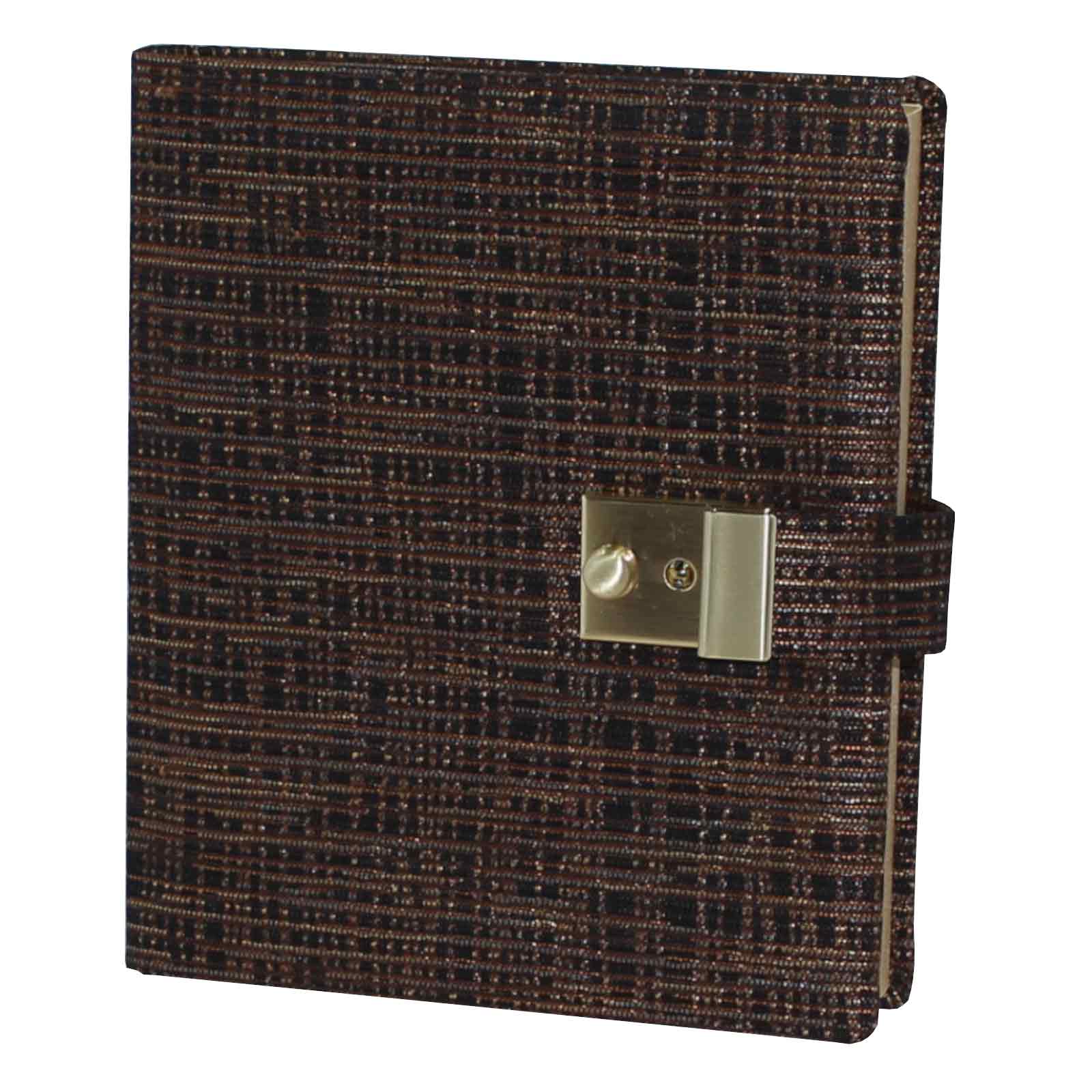 Das Tagebuch Tessy in Schwarz-Gold mit goldenem Schloss und passendem Schlüssel ist handgefertigt und kann als Kalender oder Notizbuch oder beispielsweise als Reisetagebuch verwendet werden. Der Softcover-Einband aus Baumwoll-Stoffeinband überzeugt durch seines feines Webmuster in Schwarz-Gold. Der Stoffeinband stammt aus deutscher Herstellung und ist zu 100 Prozent chemiefreie verarbeitet.
