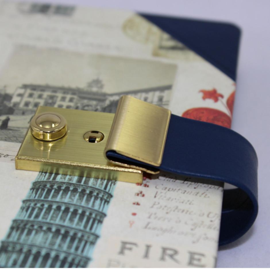 Das Tagebuch Pisa mit Schloss entsteht durch eine Kombination aus blauem italienischem Vollrindleder, sowie einem dazu passenden Hartcover mit eleganten Pisa-Motiven.